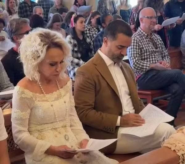 Para a ocasião, a apresentadora do Mais Você escolheu novamente um vestido de noiva exclusivo criado por Lethicia Bronstein — mesma estilista que confeccionou o primeiro vestido com que Ana casou com Fábio, numa cerimônia intimista, em 4 de abril, na casa dos dois, na capital paulista. “Bênção das nossas alianças. 28/06/2025”, postou a apresentadora no Instagram. Ela ainda fez uma live no Instagram mostrando a missa, com direito a leitura de Mariana Maffeis, primogênita da apresentadora.