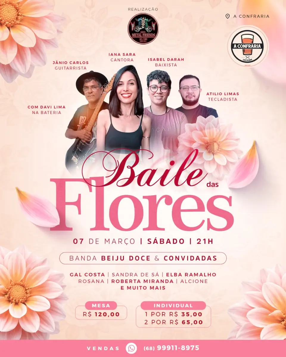 Em uma noite dedicada à celebração do Dia Internacional da Mulher, o espaço A Confraria recebe, no próximo sábado, dia 7 de março, o evento “Baile das Flores”. Com início programado para as 21h, a festa busca homenagear o público feminino através de um repertório que atravessa gerações e exalta a força da música brasileira.