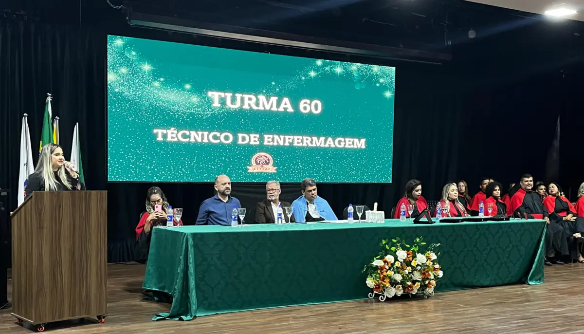 O Centro de Educação Técnica e Especializada do Acre (CETEAC) realizou, na noite dessa sexta-feira (22), a formatura de 54 profissionais de quatro turmas — três de Técnico em Enfermagem e uma de Radiologia. A solenidade ocorreu no auditório da Livraria Paim, em Rio Branco (AC).