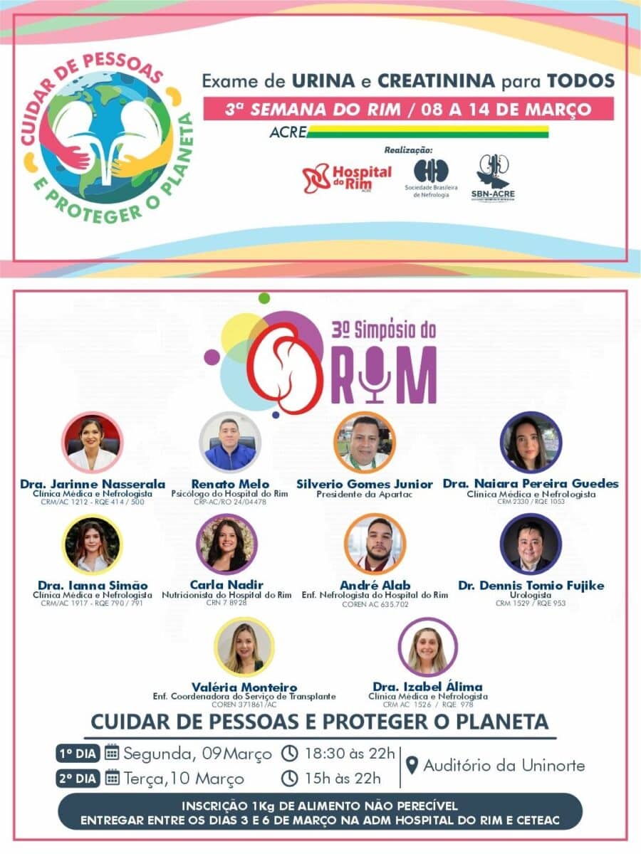 Nos dias 9 e 10 de março, será realizado o 3º Simpósio do Rim, também na Uninorte, em Rio Branco. O evento terá perfil acadêmico, voltado a profissionais e estudantes da área da saúde, com atualização científica sobre prevenção, diagnóstico e tratamento das doenças renais.