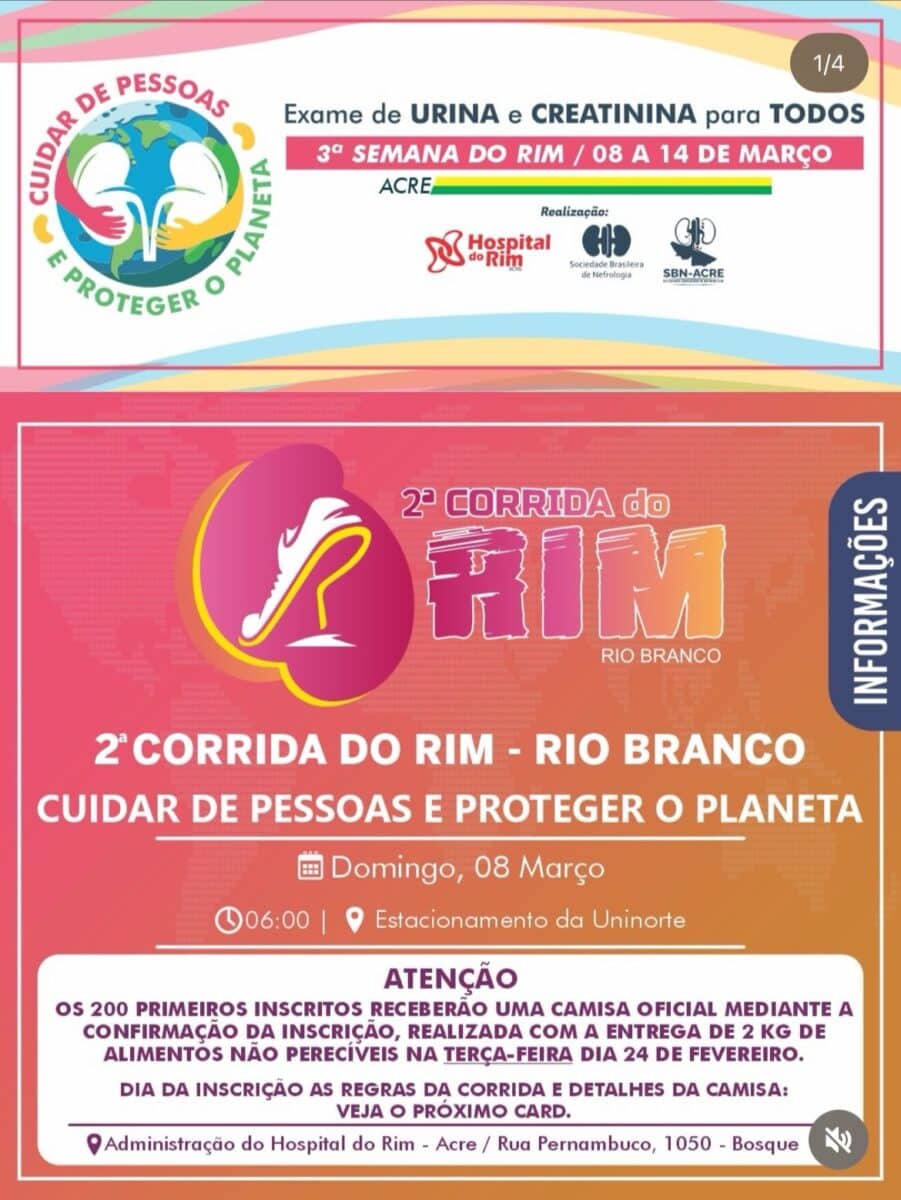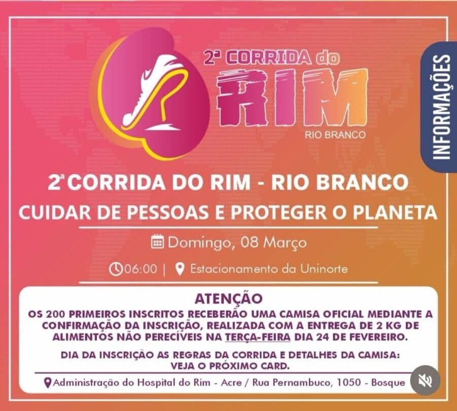 A 3ª edição da Semana do Rim no Acre começa neste domingo (8) com a 2ª Corrida do Rim, que será realizada a partir das 6h, na Uninorte, em Rio Branco.