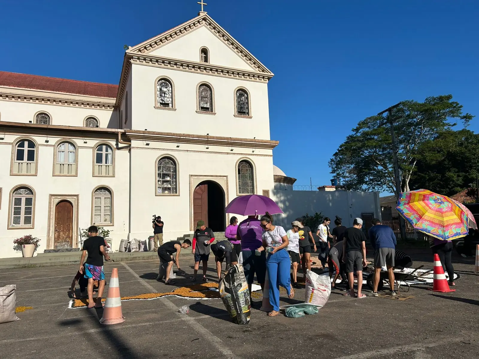 A serragem usada nos tapetes começou a ser preparada há cerca de três meses, com um trabalho minucioso de peneiração, secagem e tingimento. A produção é feita por integrantes da comunidade, catequizandos, famílias e a reitoria da catedral, que reforça o espírito comunitário da celebração.