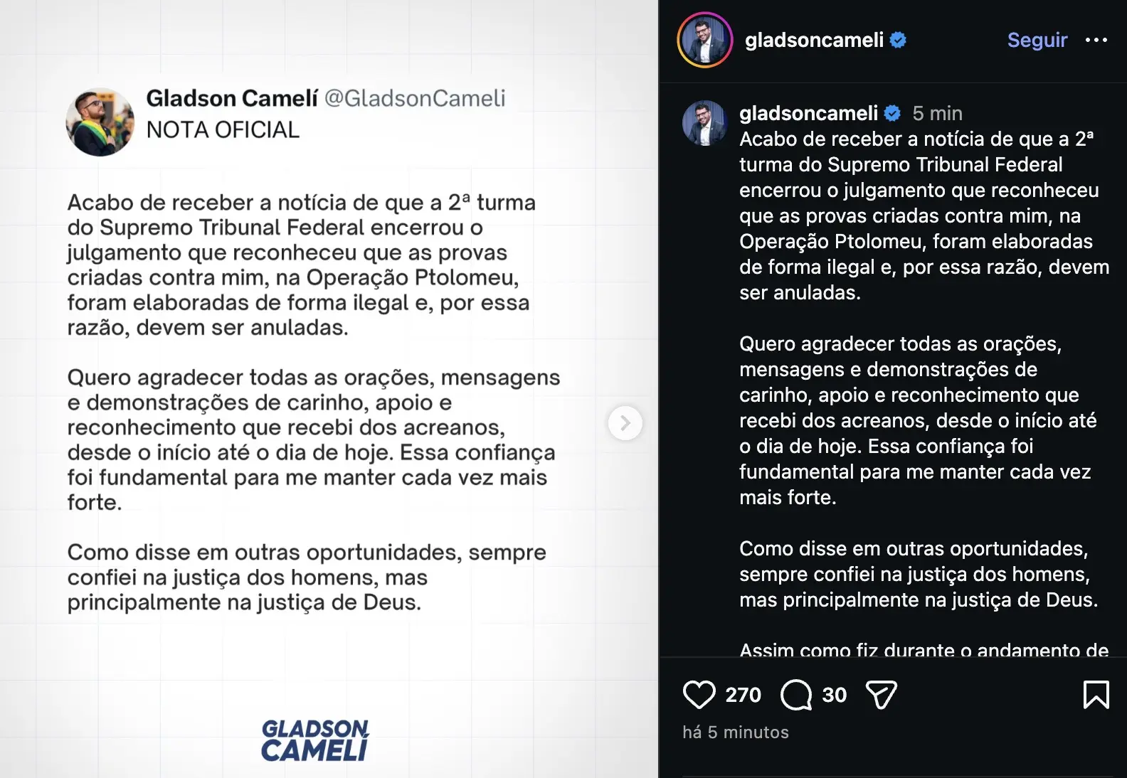 Gladson Cameli também voltou a adotar um tom de fé ao comentar o desfecho do julgamento, reforçando que sempre acreditou no resultado favorável. “Como disse em outras oportunidades, sempre confiei na justiça dos homens, mas principalmente na justiça de Deus”, afirmou.