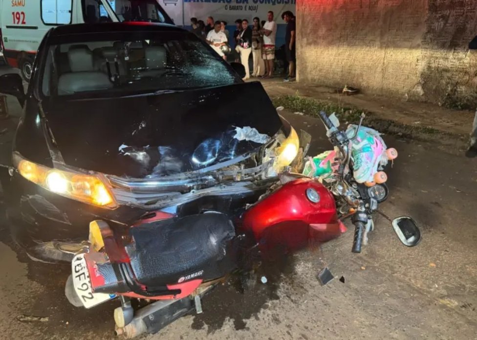 O motociclista Juvenil Gomes Leite, de 49 anos, a esposa Michelle e uma criança de 8 anos ficaram feridos após um acidente ocorrido na noite deste sábado (21), no cruzamento da Rua Fonte Nova com a Rua Padre Cícero, no bairro Conquista, em Rio Branco.