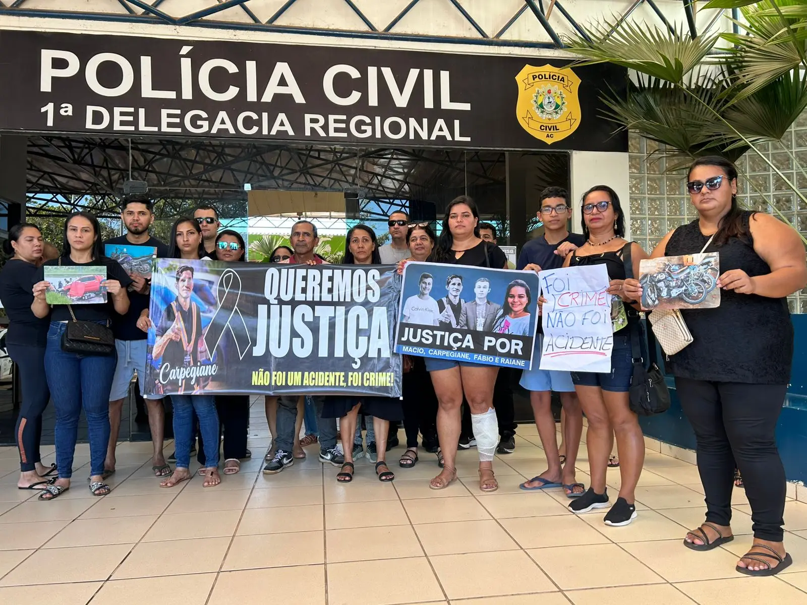 Três meses após o grave acidente na Via Verde, em Rio Branco, que matou três pessoas e deixou uma mulher ferida, familiares das vítimas e a única sobrevivente realizaram na manhã desta segunda-feira (21) um protesto em frente à Primeira Delegacia Regional da Polícia Civil. O grupo cobra celeridade nas investigações e responsabilização do motorista da caminhonete que invadiu a pista contrária no dia 17 de abril, causando o impacto fatal.
