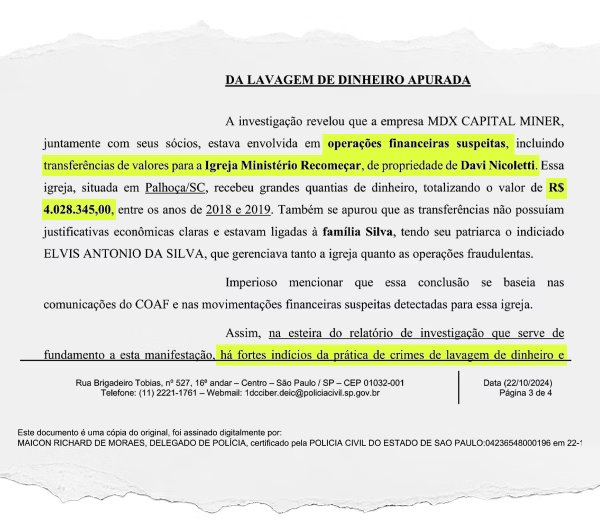 “A fim de maquiar lastros do dinheiro arrebanhado de forma fraudulenta, tais pessoas enviaram dinheiro para a conta pertencente à Igreja Ministério Recomeçar, de propriedade do pastor Davi Nicoletti”, diz o relatório policial. “Também se apurou que as transferências não possuíam justificativas econômicas claras”, prossegue.