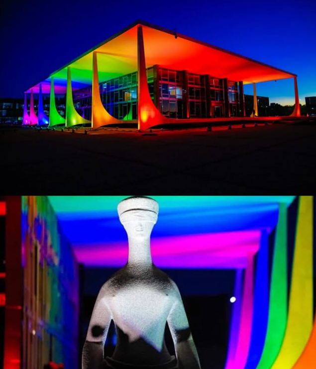 Nas noites de segunda (23) e terça-feira (24) desta semana, o edifício-sede do Supremo Tribunal Federal (STF), em Brasília, ganhou uma iluminação especial com as cores da bandeira LGBTQIAPN+, em homenagem ao mês do Orgulho. A ação simbólica reafirma a importância da visibilidade e do respeito às vidas LGBTQIAPN+ no país.