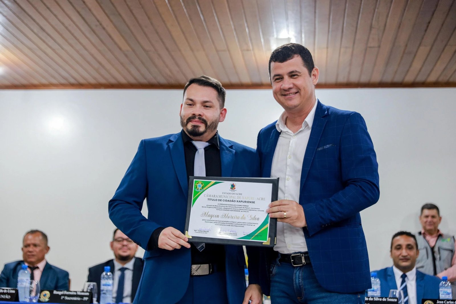 Na noite da última quinta-feira (27), o vereador Maycon Moreira (PSD) foi agraciado com o Título de Cidadão de Xapuri, uma das mais altas honrarias que um indivíduo pode receber no município. A cerimônia ocorreu no auditório da escola Antero Soares Bezerra e contou com a presença de diversas autoridades, incluindo a vice-governadora Mailza Assis, que também recebeu a mesma honraria.